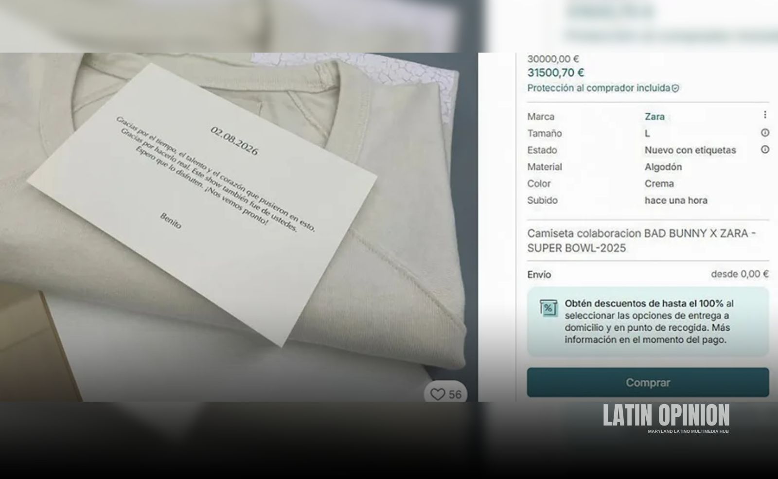 ‘Camiseta Bad Bunny Zara’ es, con alguna variante, el mensaje con el que se ofertan ahora las camisetas en las web de compraventa, acompañadas de fotos de las mismas y de la tarjeta en la que está escrito: «Gracias por el tiempo, el talento y el corazón que pusieron. Gracias por hacerlo real. Este show también fue de ustedes. Espero que lo disfruten. ¡Nos vemos pronto!».