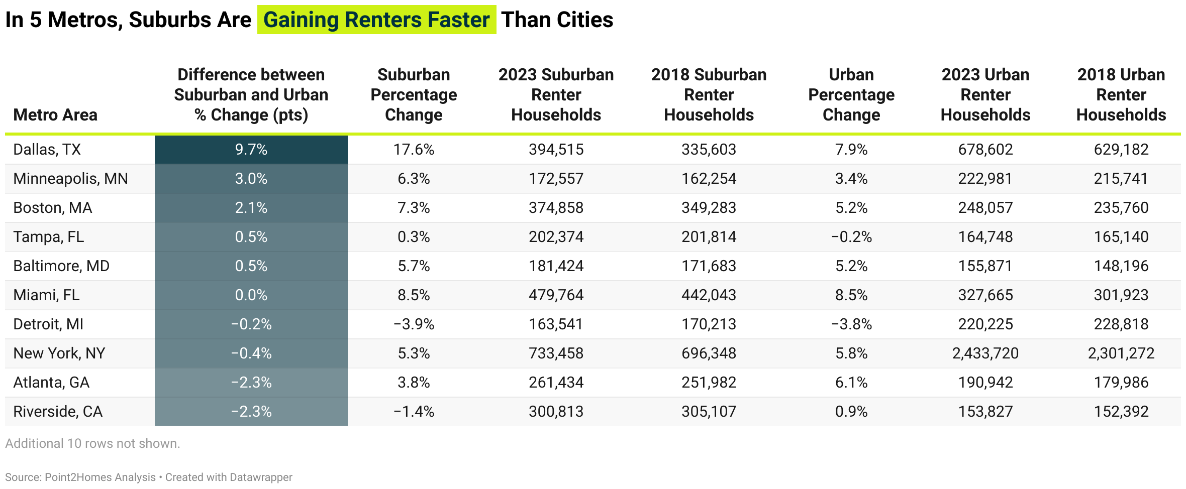 Tendencia nacional más amplia: en las 20 áreas metropolitanas más grandes de EE.UU., más de 200 suburbios ahora tienen mayoría de inquilinos — incluyendo 15 que cambiaron de mayoría de propietarios a inquilinos en el mismo período de cinco años.